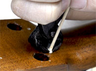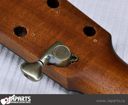 Now you can use a brown felt marker to colour the plug to better match the wood9. It doesn't really have to match exactly, since the hole is mosty covered by the machine head10. In our case you can still see the plugs, but only if you look very closely11. From a distance they can't be seen and once they're covered they're only visible to people who.. were likely already irritated. ;-)